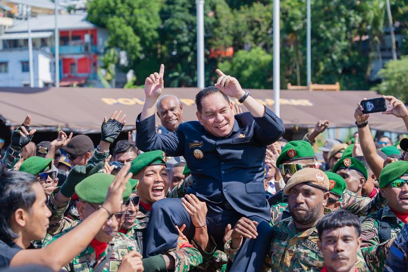 Puluhan prajurit TNI tandu Bupati Fakfak. Samaun Dahlan saat menghadiri Upacara memperingati HUT TNI – AD Ke-80. (5 Oktober 2025). momen yang sama berkenaan dengan ulang tahun Bupati Fakfak ke-57. (5 Oktober 2025)