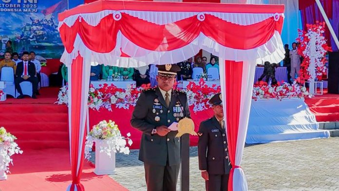 “Dirgahayu Tentara Nasional Indonesia ke-80. TNI Prima, TNI Rakyat, Indonesia Maju,” seru Letkol Inf Eko Handono membuka pidato amanat Panglima TNI.