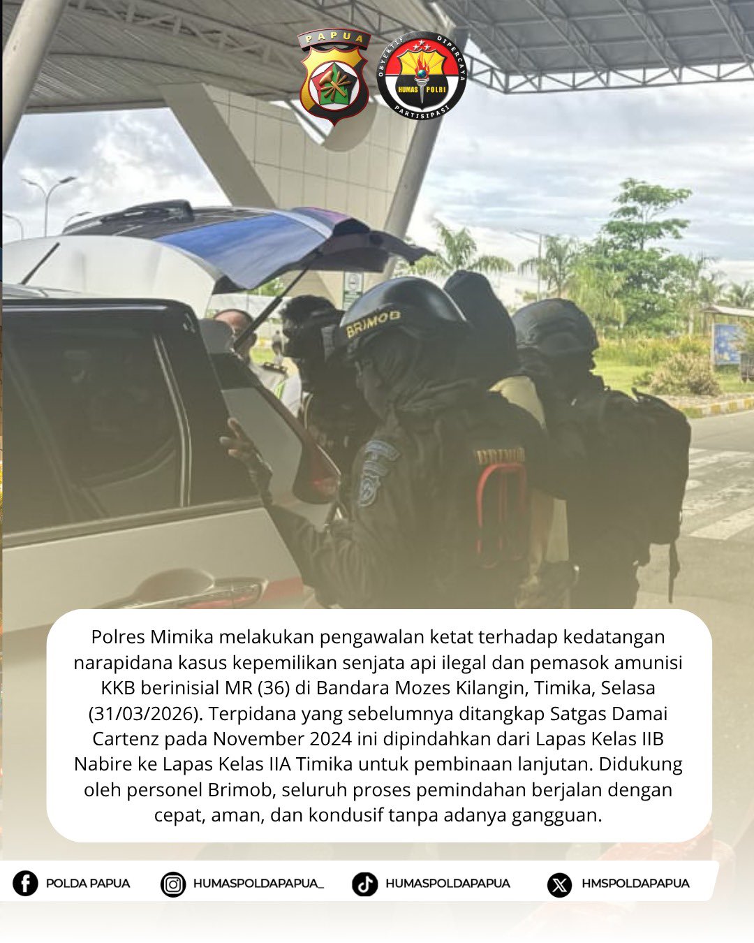 Mimika – Aparat kepolisian melakukan pengamanan dan monitoring kedatangan seorang narapidana kasus kepemilikan senjata api dan bahan peledak di Bandara Mozes Kilangin, Timika, Papua Tengah, Selasa, (31/3/26) siang.