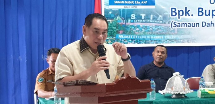 Fakfak – Bupati Fakfak. Samaun Dahlan saat memberikan Kuliah Umum di Kampus STIA Asy-Syafiiyah Fakfak, Selasa, 7 Oktober 2025 kemarin. menegaskan pendidikan gratis merata untuk semua jenjang pendidikan, baik Negeri maupun Swasta. OAP maupun Non OAP
